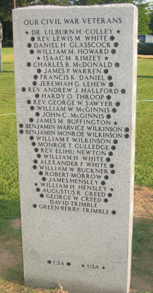 This memorial project identifies both Union and Confederate veterans of the Civil War who lived, owned property, were active members of a church, or were buried within a four mile radius, centered on Pleasant Run Baptist Church in Colleyville, Texas. This monument to their memory is being erected at the church. It takes the form of three upright granite tablets engraved with names on both sides, along with an upright marble dedicatory stone explaining the markers. When you are passing by Pleasant Run Baptist Church, please take a moment to stop and see what weve done. The first tablet includes the names of several area pioneers for whom streets and communities are named, including Dr. Lilburn H. Colley, William L. Hurst, Felix G. Bransford, Harvey R. Sparger, and many others. My collaborators in this project are my mother, Doris Jo Patterson, and Jimmy Reynolds, a lifelong friend. The three of us have lived a total of more than one hundred fifty years in this community, and we are deeply interested in preserving its past. My mothers family settled in Colleyville in 1879, and the Reynoldses arrived in 1902. Civil War Veterans of Northeast Tarrant County (Biographies) Community Civil War Veterans Memorial Website