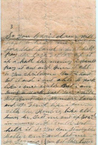 A little history: William Jennings Reed was born about 1851 in Tennessee. His first wife was Josephine...I believe her family name was Holder, but I have not proved that. The were married in Tennessee. They had four children. George Thomas born 1869, married Arminta Hines in Tarrant County in 1897. (Arminta was a daughter of the Hines that Reed mentions in his letter) Martha born 1873, married Charles B Probst in Tarrant County in 1896. She died 1909. Rutha born about 1875, married J. L. Wilemon in Tarrant County in 1894. (I can find nothing further on her.) Sue was born June 1887 and died Jan 1888. She is buried in Estes Cemetery. Josephine died 1897 and is also buried in Estes Cemetery. This letter was written to Tomy (George Thomas) telling him that he was remarrying. Will Jennings married Rachel Emma Watson in 1898. Her first husband was William Slaton, they were divorced, and they had four children. George born 1888, Maude born 1890, Lula born 1892 and Gus born 1893. Rachel Emma was a daughter of John J Watson and Mary Louise Elliott...both early settlers in Tarrant County. Mary Louise died in 1877. Will and Rachel had two daughters, Willie Irene in 1899 and Rachel Emma (my mother-in-law) in 1901. Rachel Emma Watson Reed died in 1903 and Will died in 1909. The two young girls were raised by their half brother Tommy. There must have been problems between Will and the Watson family. My mother-in-law knew nothing about her mother or her mother's family. She never knew she had four half siblings by her mother. I found that out after her death in 1972. Confusing, huh? |