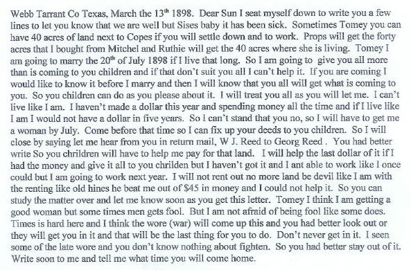 This letter was written by my husband's grandfather, William M Reed, in 1898. His first wife had died and he was advising his son he was remarrying. His new wife was a daughter of John J. Watson. The Watson's were early settlers in Tarrant County. John J. Watson's first wife, mother of the new Mrs. Reed, was Mary Louise Elliott, daughter of Richardson M. Elliott, another early settler. |