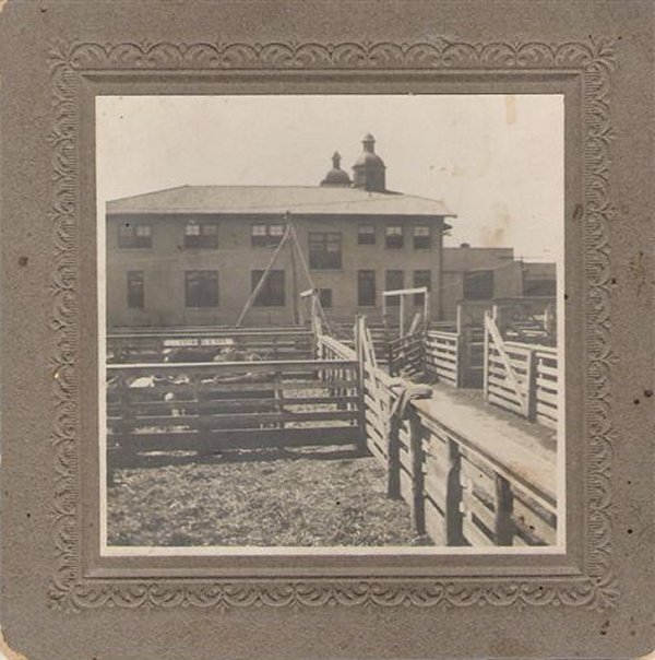 View of cattle pens looking east, behind the Live Stock Exchange Building (on right). |