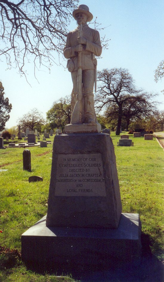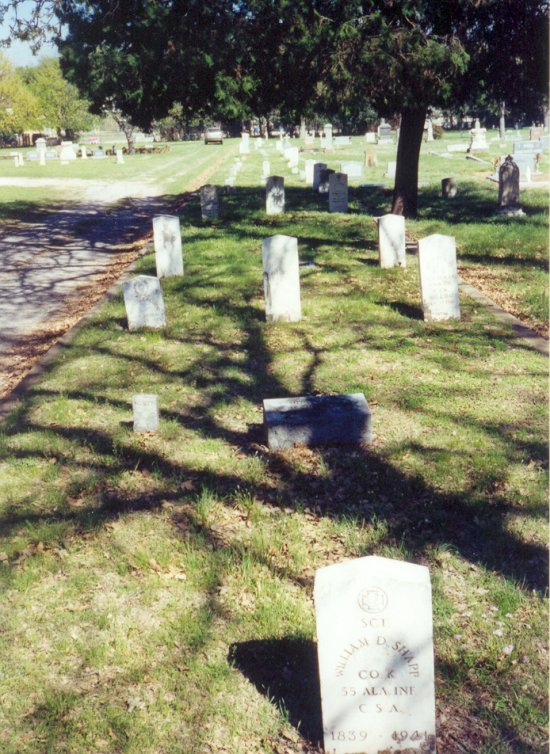 Looking east from the statue, Soldier's Row contains 3 rows of graves between two curbs, and extends to near where the pickup is parked in the background. To the right is Calvary Cemetery. To the left is the oldest section of Oakwood. See the Oakwood Cemetery Block Map to locate. |